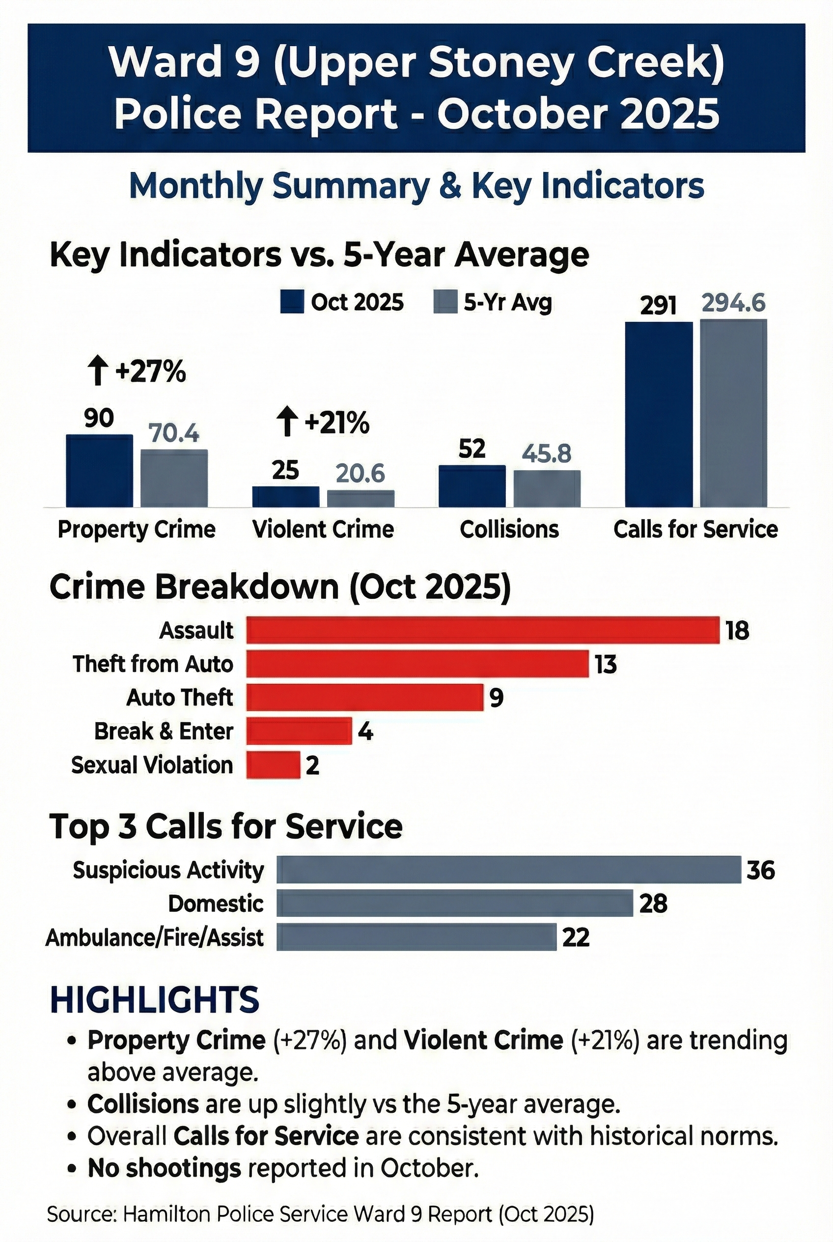 Ward 9 City Councillor Brad Clark has publicly released the monthly Hamilton Police crime statistics report for Ward 9 that covers the month of October.