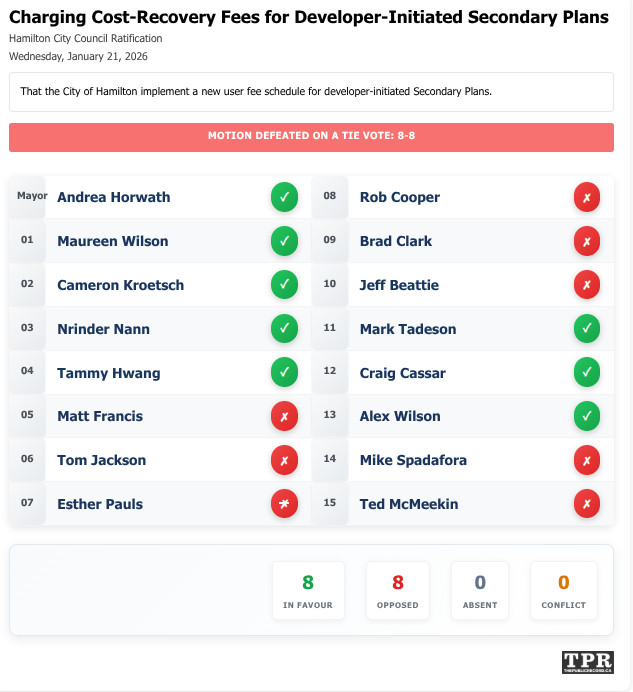 This week, a staff proposal to implement cost-recovery fees for developer-initiated secondary plans failed on a 8-8 tied vote.